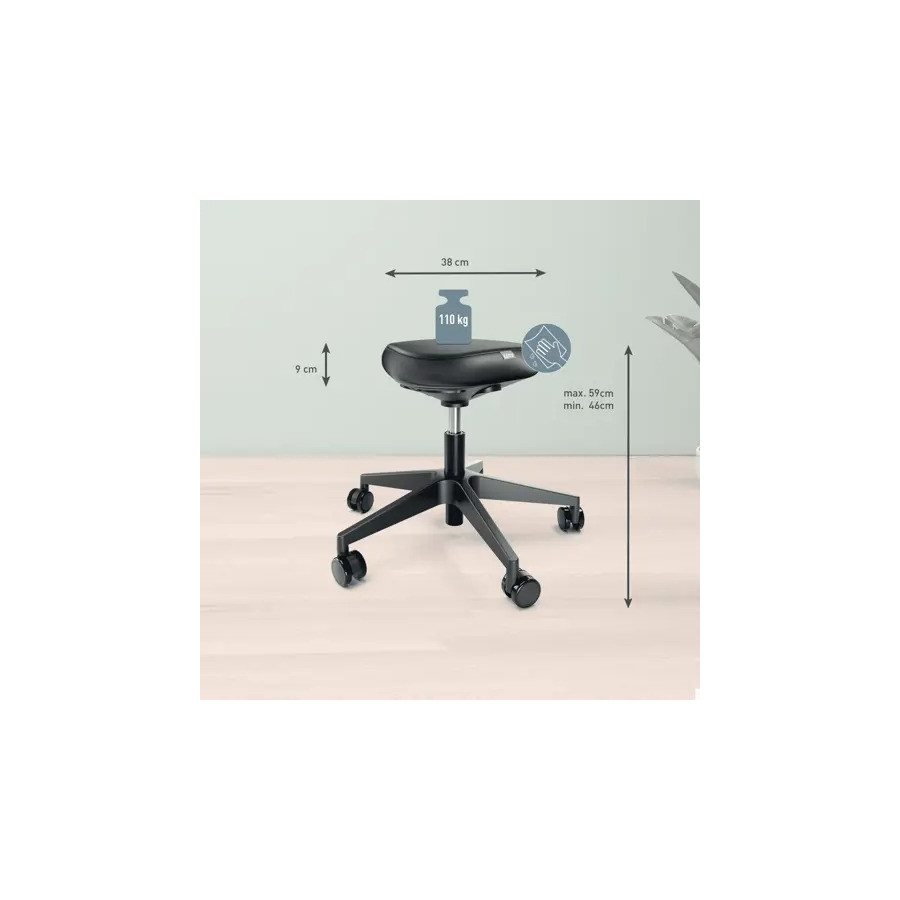 Monté sur une base stable de 60 cm avec 5 roulettes pivotantes à 360°, ce tabouret offre une excellente mobilité tout en évitant les basculements. Son réglage pneumatique de 46 à 59 cm permet d’adapter facilement la hauteur à votre position de travail grâce à 3 boutons-poussoirs ergonomiques. Léger, compact et facile à ranger, il glisse facilement sous un bureau.